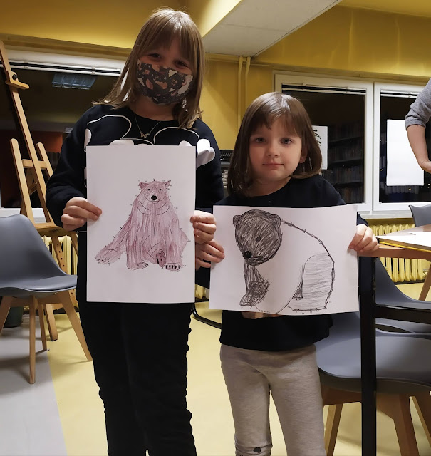 Czytania na dywanie dzieci wysłuchały historii Hugo i Hektora, bohaterów książki "Niedźwiedź, pianino, pies i skrzypce" Davida Litchfielda. Następnie, przy pomocy ilustracji zwierząt, wykonały rysunki różnych gatunków niedźwiedzi.